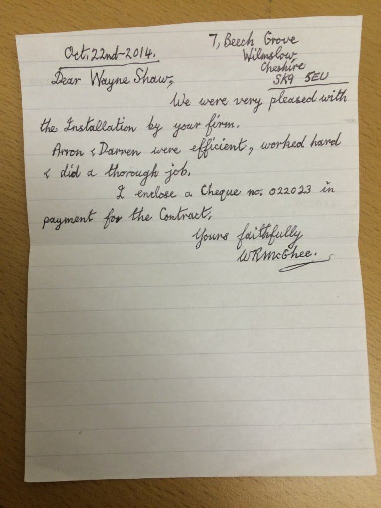 Mr W. R. McGhee of Beech Grove, Wilmslow, thank you for your letter and much appreciated endorsement!