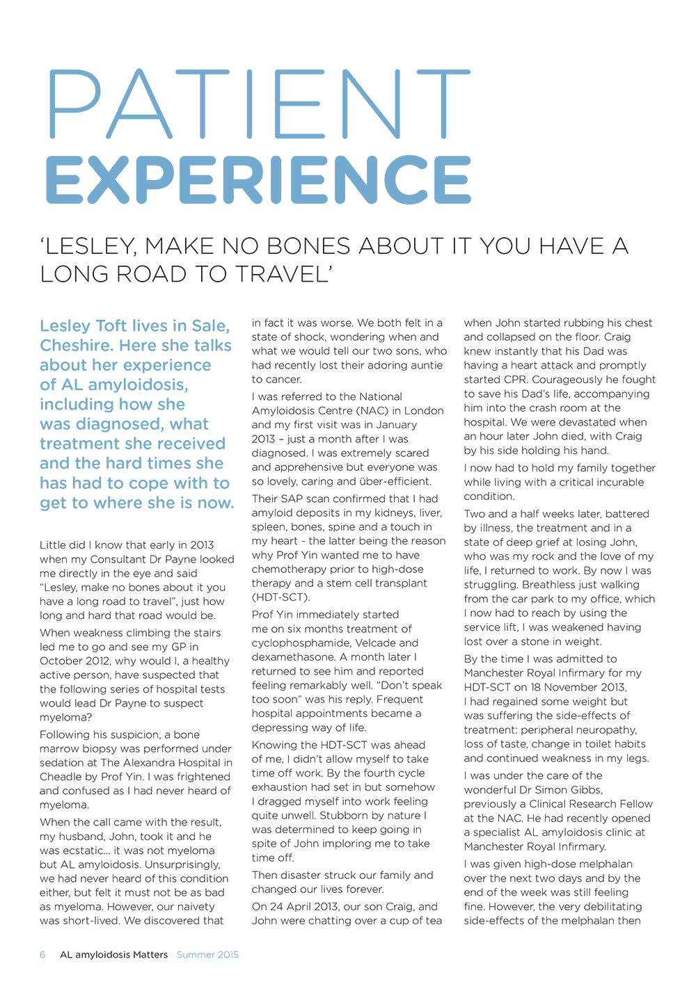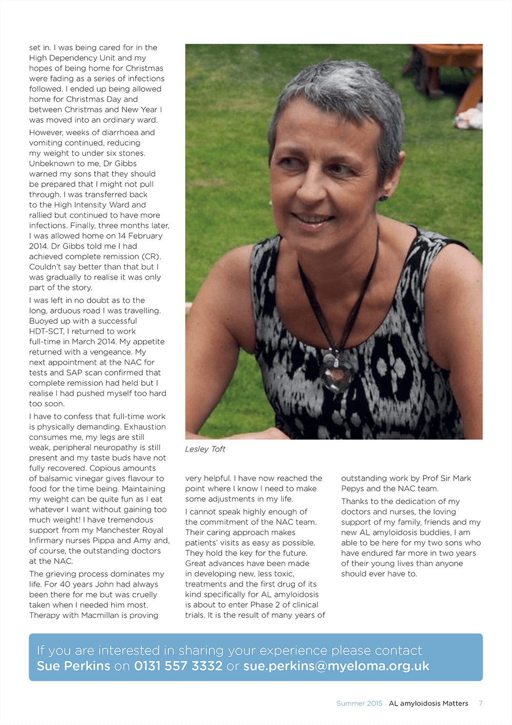 Current treatment is various forms of very tough chemotherapy but this can only slow progression of the disease as there is no cure. New, better and less toxic treatments are on the horizon and currently doing well in clinical trials. These cost many millions of pounds. The NAC in collaboration with the leading drug company Glaxo-Smith-Kline is very optimistic about a new drug which can destroy amyloid deposits and clear them from organs. It has been invented by a leading Professor at the NAC. If proven effective it will significantly improve the quality of life for sufferers.